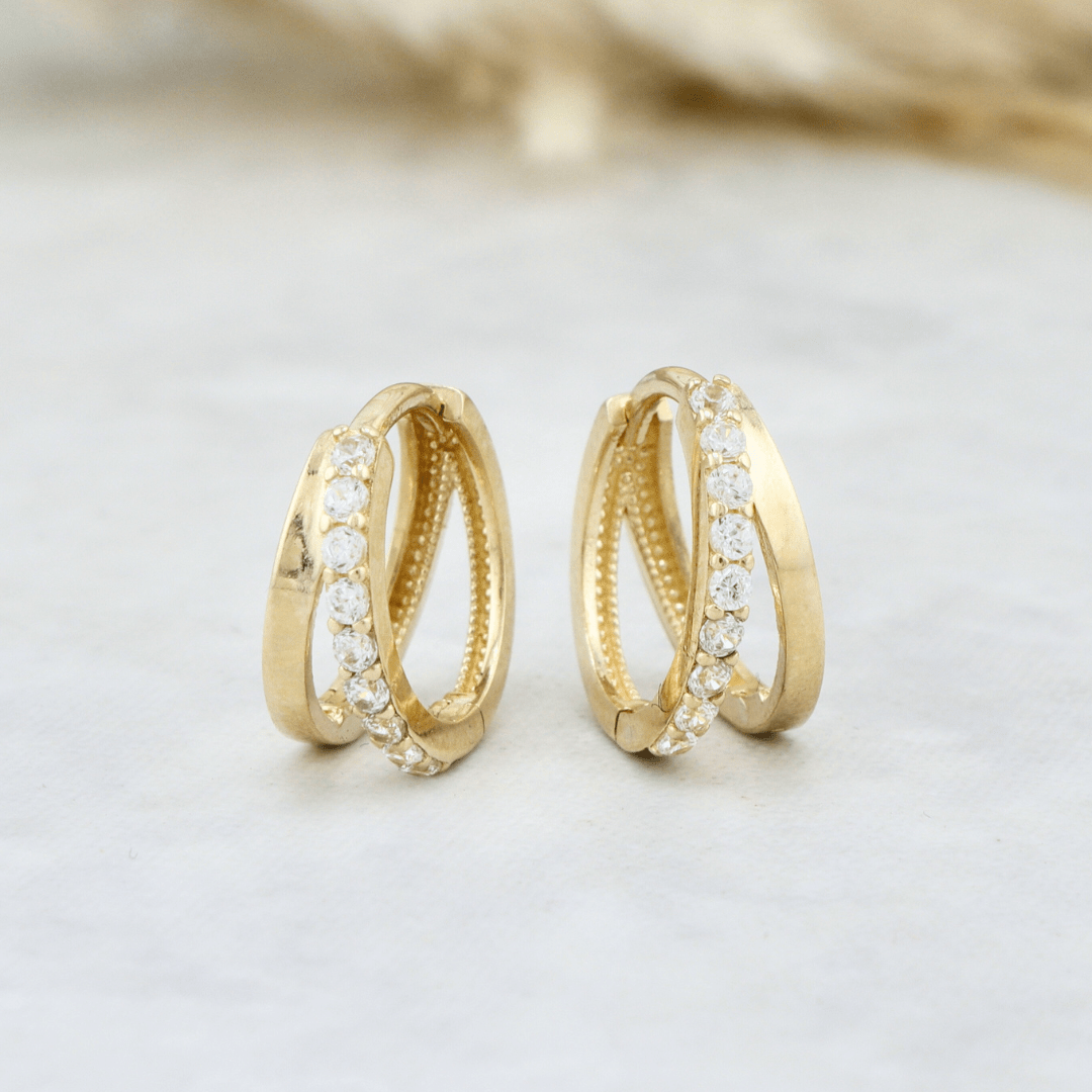 Boucles d'oreilles huggies Double rang en or 10K avec rang de zircons cubiques sertis pour un look élégant et polyvalent pour toute personne, de l'enfant à l'adulte.