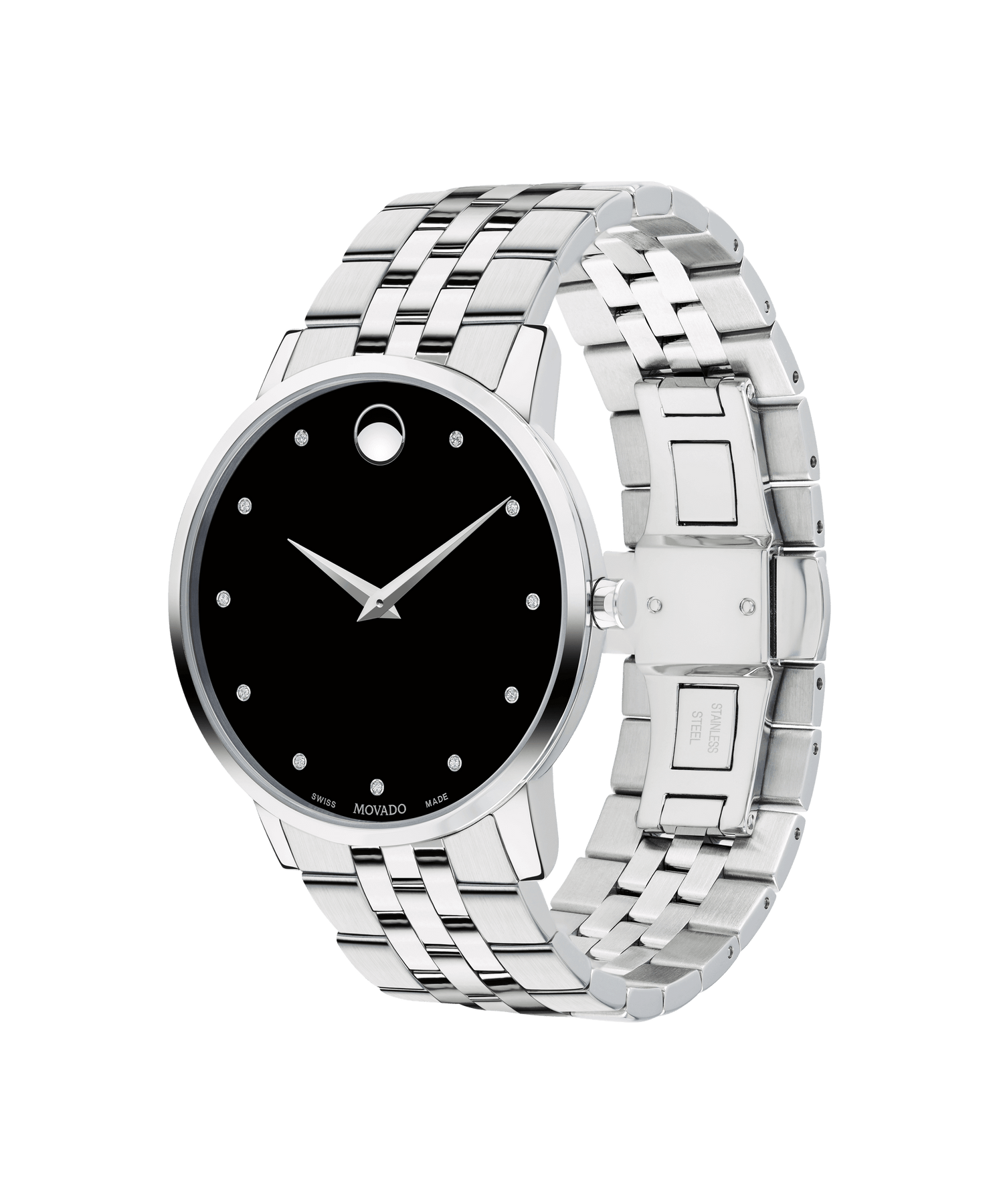 Men's Museum Classic watch, 40 mm stainless steel case, round black dial with 11 diamond markers (0.043 tcw) and silver-toned dot and hands, stainless steel link bracelet with deployment clasp.